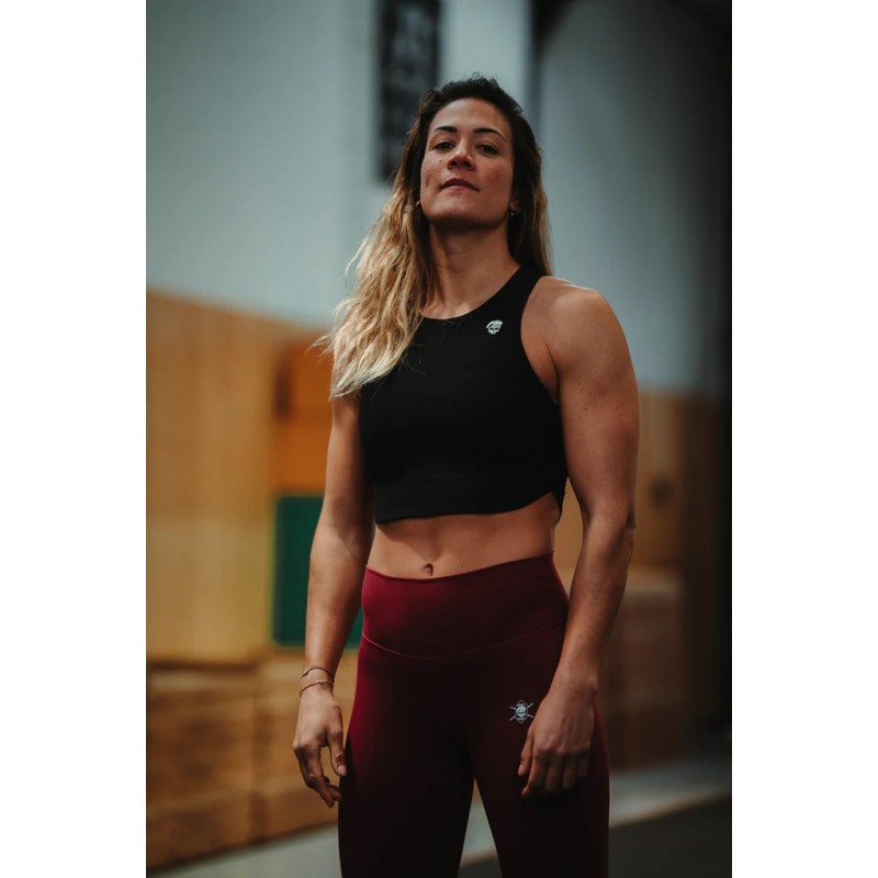 Brassière sport femme haute CHEST TANK - DONNA noire de chez BARBELL REGIMENT. Ce crop top brassière intégrée noire monte sur l'avant au niveau du coup. Elle dispose de deux larges bretelle et du logo tête de mort de la marque en haut à gauche.
