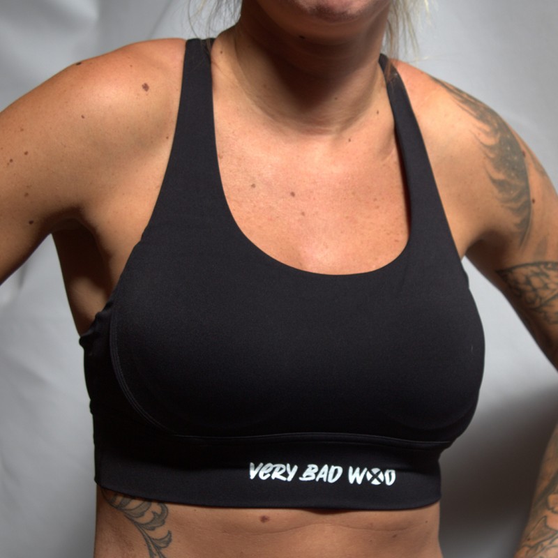 Cette brassière noire EVA coupe arrondie avec le logo VERY BAD WOD présent en blanc sur l'avant de la brassière.