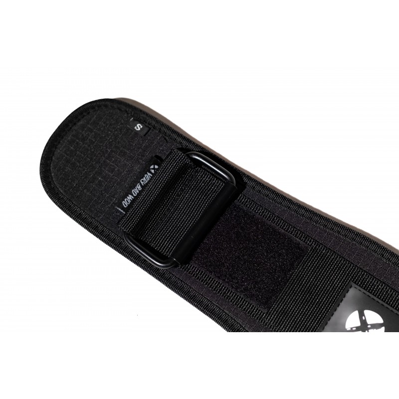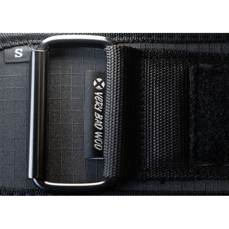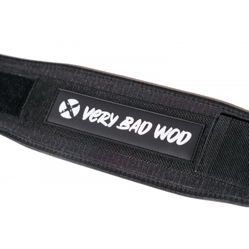 Ceinture de protection VERY BAD WOD couleur noire à patchs personnalisables pour l'haltérophilie avec le logo VERY BAD WOD sur l'arrière.