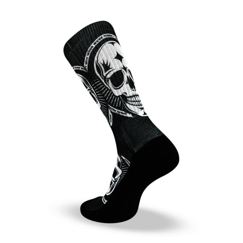 Chaussettes sport noir hautes au design original conçu en partenariat avec Northern Spirit. Dessous renforcé noir. Skull NS blanche sur l'avant et sur le dessus du pied.