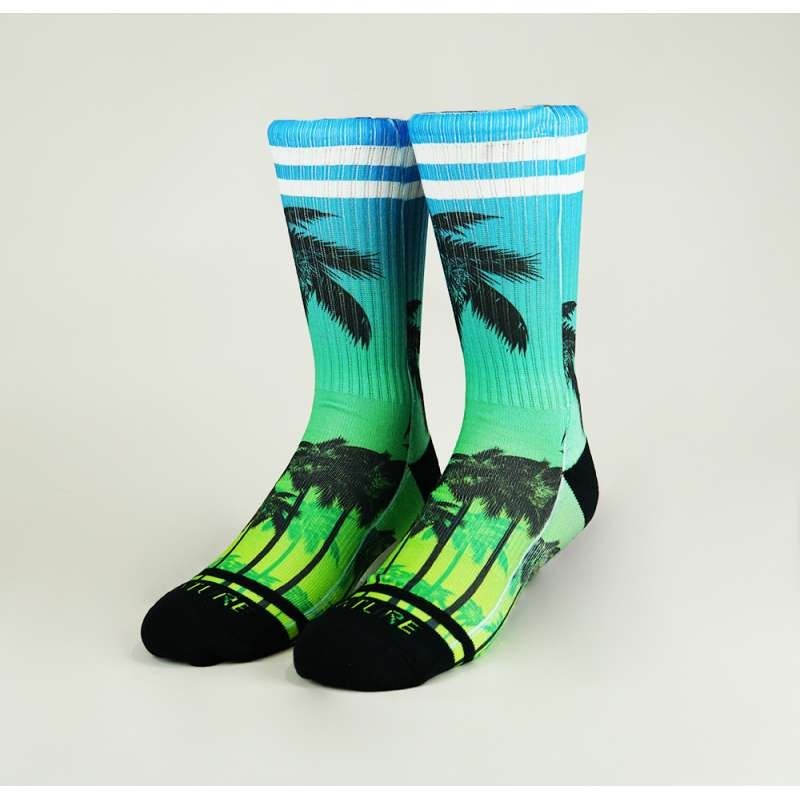 Chaussettes sport Flashy dans les tons bleus et verts avec des palmiers noirs dessus.