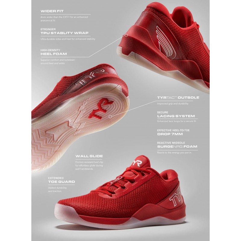 4 mm plus larges que les CXT-1 pour une stabilité et un confort anatomique optimum. Elargissement de la partie de protection avant. Semelle extérieure TYRTAC ™. Mousse de Talon haute densité pour un amorti parfait lors des WODS. La partie lacet à également été revue pour améliorer la tenue lors des entraînements. Un drop qui passe de 7mm à 9 mm.
