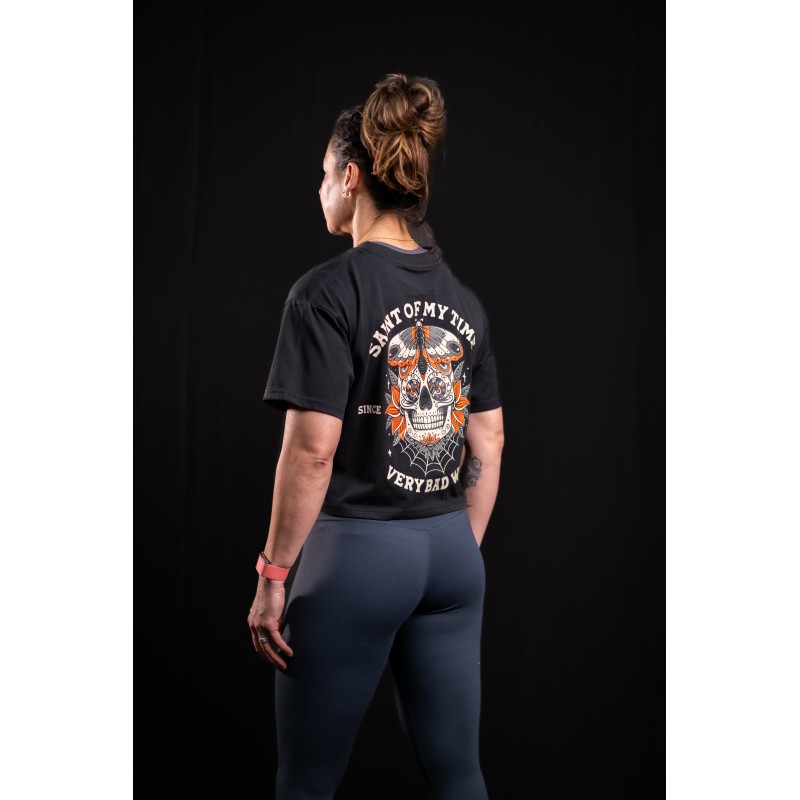 Ce Crop Top oversize noir SAINT OF MY TIME est idéal pour les pratiquant de disciplines sportives intensives telles que le Cross Training ou le CrossFit® cherchant le confort et le style. Design coloré by VERY BAD WOD.