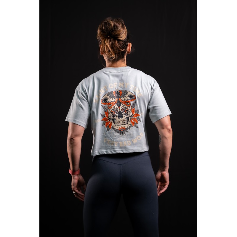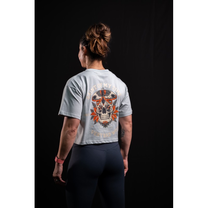 Ce Crop Top oversize vert de gris SAINT OF MY TIME est idéal pour les pratiquant de disciplines sportives intensives telles que le Cross Training ou le CrossFit® cherchant le confort et le style. Design coloré by VERY BAD WOD.