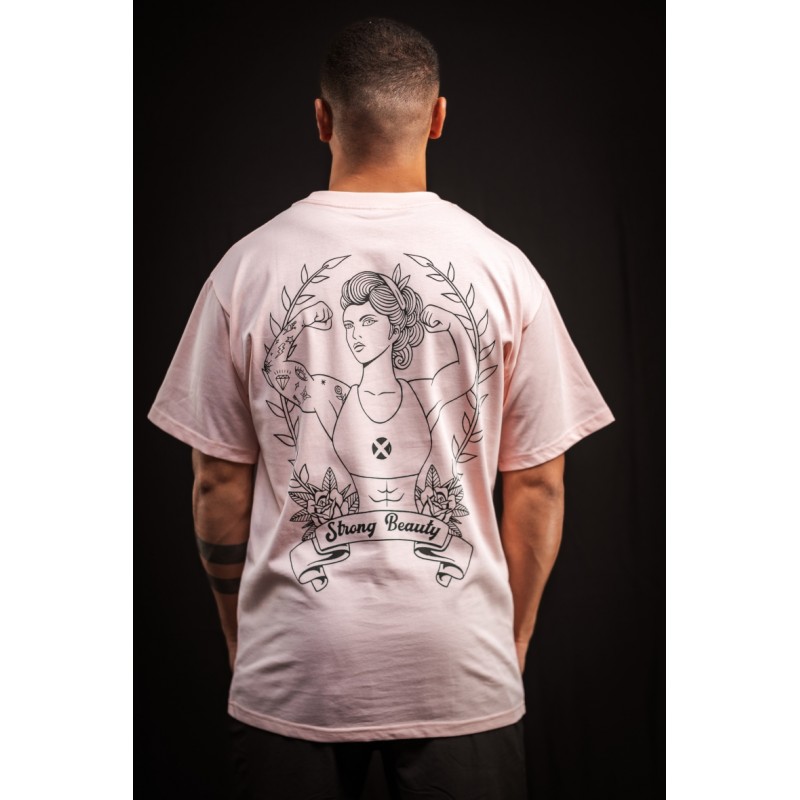 T-shirt coupe oversize unisexe de couleur rose clair modèle STRONG BEAUTY.