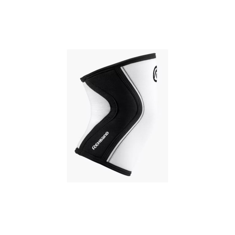 Genouillères protection genoux blanches et noires 5 mm avec le logo Rehband noir sur l'avant du genoux.
