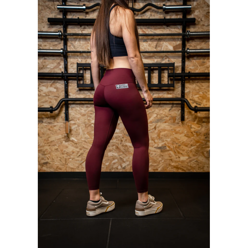 Legging femme entraînement THE OLY rouge profond avec le logo BARBELL REGIMENT sur l'étiquette brodée arrière et en version logo blanc sur l'avant au niveau de la hanche.