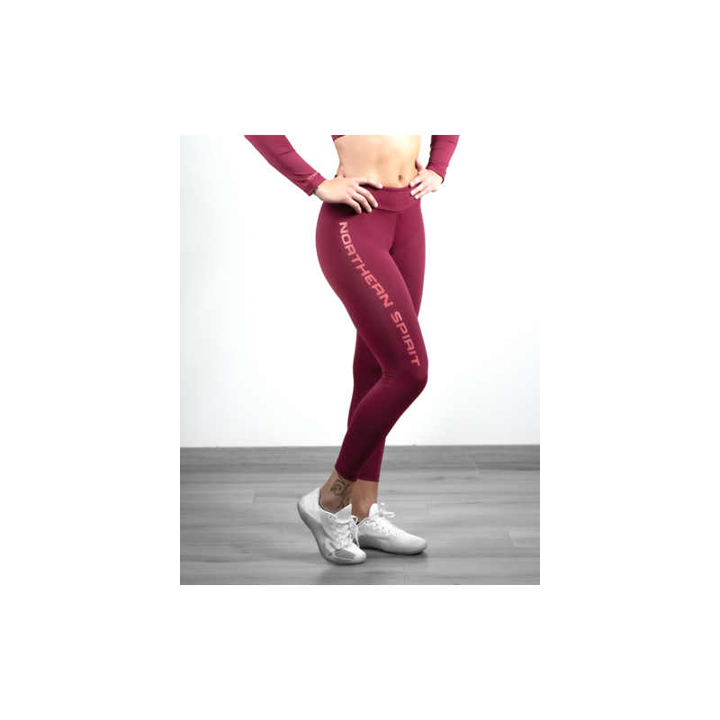 Legging femme 7/8 taille basique POLARIS Burgundy avec la marque NORTHERN SPIRIT sérigraphiée sur le côté droit de la jambe ainsi que le logo sur le haut gauche.