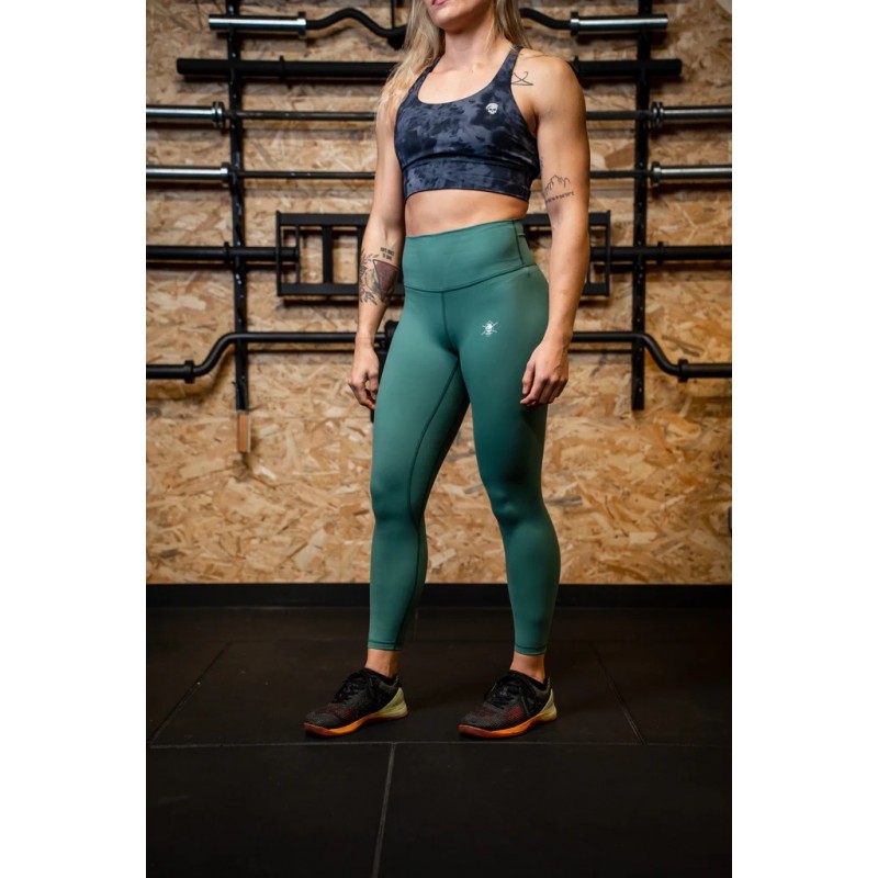 Legging femme entraînement THE OLY vert sea avec le logo BARBELL REGIMENT sur l'étiquette brodée arrière et en version logo blanc sur l'avant au niveau de la hanche.