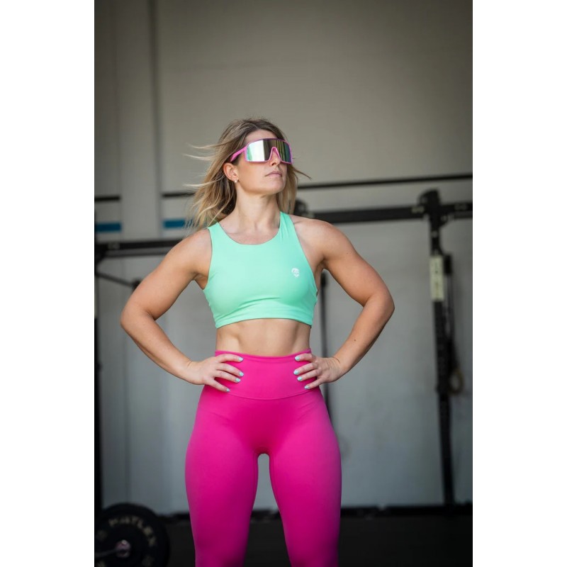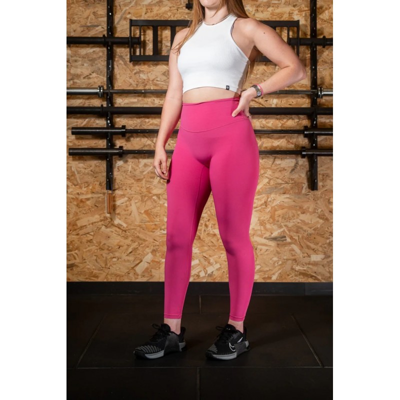 Legging femme entraînement LILY rose flashy avec le logo BARBELL REGIMENT sur l'étiquette brodée arrière et en version logo blanc sur l'avant au niveau de la hanche.