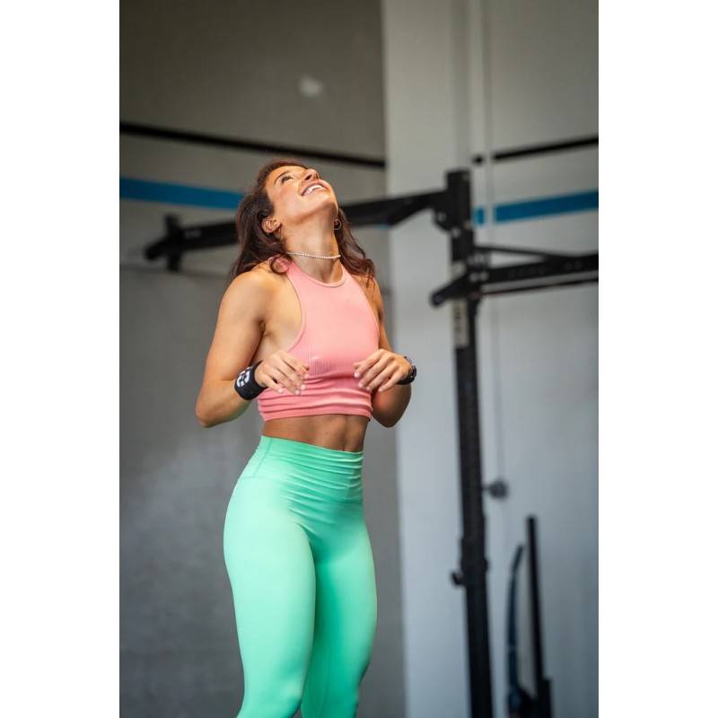 Legging femme entraînement SOFY vert flashy avec le logo BARBELL REGIMENT sur l'étiquette brodée arrière et en version logo blanc sur l'avant au niveau de la hanche.