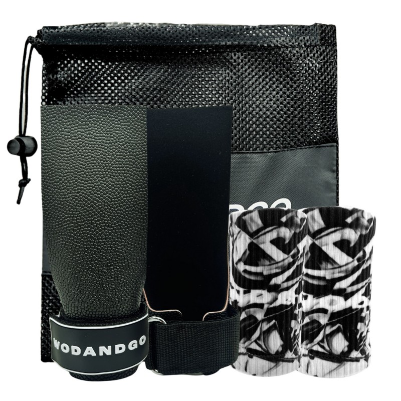 Le pack est composé des maniques GYM BLACKGRIP Basketball V2 noir, wristband Rich et d'un sac de transport proposées par WODANDGO est complet.