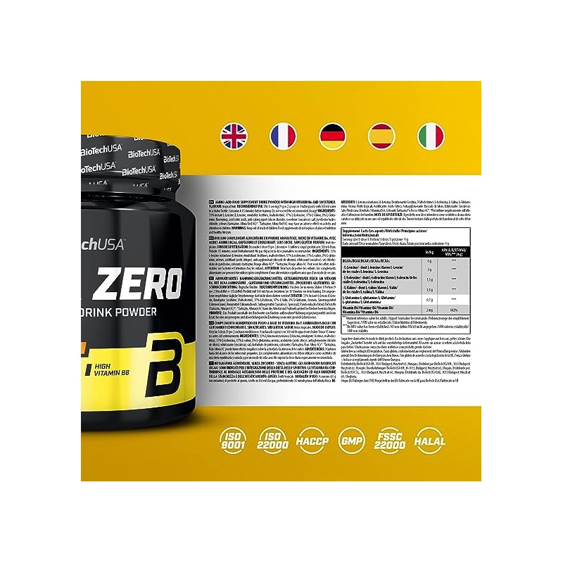 BCAA Zero est un produit alimentaire composé d’acides aminés en poudre qui peut être consommé avec n’importe quel type d’entraînement sportif et qui ne contient aucun ingrédient inutile. Il est sans gluten, sans lactose, sans aspartame, sans conservateurs et sans sucre. En plus des BCAA qu'il contient, 700 mg de L-Glutamine par service ont été ajoutés à cette formule d'acides aminés développée par BioTechUSA.