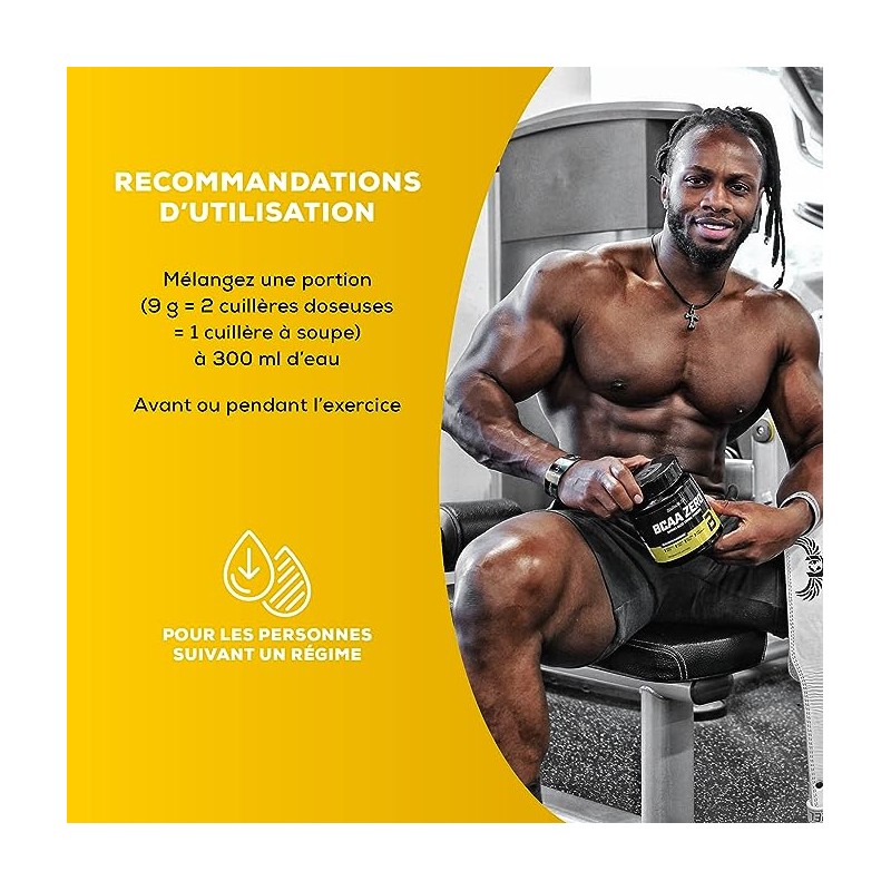 L-leucine instantané 33 % (L-leucine, émulsifiants : lécithines, maltodextrine), L-isoleucine 17%, L-valine 17 %, arômes, acide comestible (acide citrique), L-glutamine 8 %, agent anti-agglomérant (dioxyde de silicium), édulcorant (sucralose), sel, colorants (tartrazine*; indigotine), chlorhydrate de pyridoxine. *Tartrazine peut avoir des effets indésirables sur l’activité et l’attention chez les enfants.