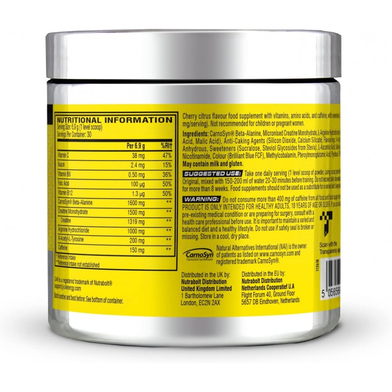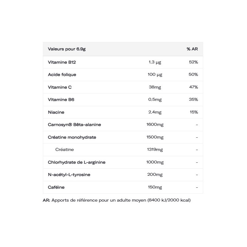 150 mg de caféine : un stimulant puissant qui booste l'énergie et la vigilance.1600 mg de bêta-alanine CarnoSyn® : réduit la fatigue musculaire et améliore l'endurance.1500 mg de monohydrate de créatine : optimise la force, la puissance et la récupération musculaire.Acides aminés et vitamines (C, B6, B12) : soutiennent le métabolisme énergétique et réduisent la fatigue.Sans sucres : pour une énergie propre et durable, sans chute brutale d'intensité.