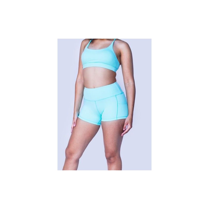 Booty short femme sport BASIC ICEE modèle bleu. Le logo Feed Me Fight Me est présent au niveau de la ceinture à l'arrière du short en gris.