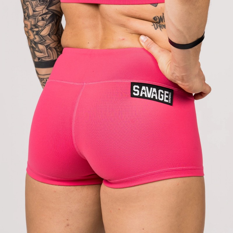 Booty short femme sport modèle STRAWBERRY couleur rose. Le logo Savage est présent à l'horizontal sur le haut du fessier droit en blanc, sur fond noir, en dessous de l'élastique à l'arrière.