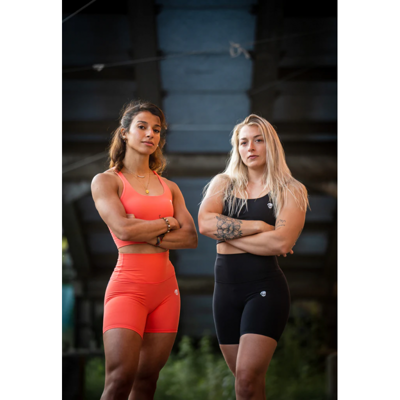 Short long femme entraînement PAULY corail avec le logo BARBELL REGIMENT en version logo blanc sur l'avant au niveau de la hanche et sur l'arrière en broderie.