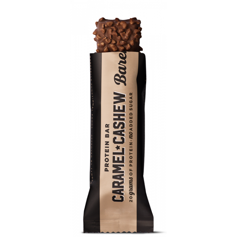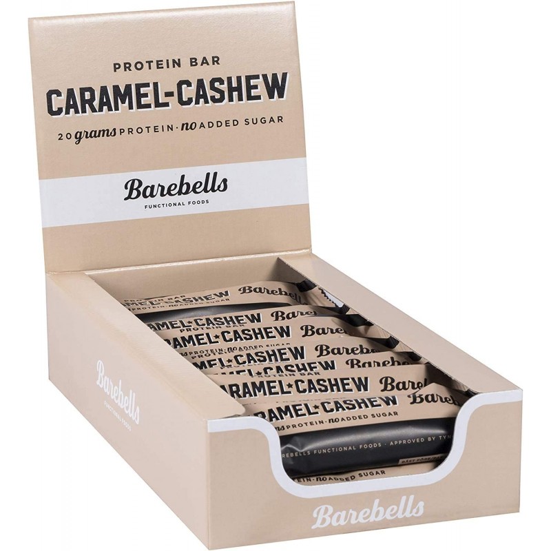 Le pack de 12 Barres protéinées naturelles et savoureuses BAREBELLS (12x55 gr), saveur CARAMEL NOIX DE CAJOU.