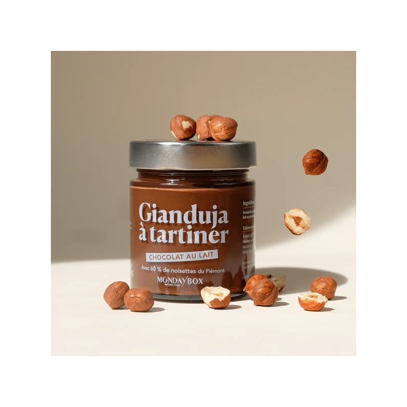 Cette pâte à tartiner de GIANDUJA - CHOCOLAT AU LAIT est composée de 60% de noisettes, ainsi que de produits naturels. Et cela, sans huile de palme afin de vous proposer cette pâte aussi onctueuse.
