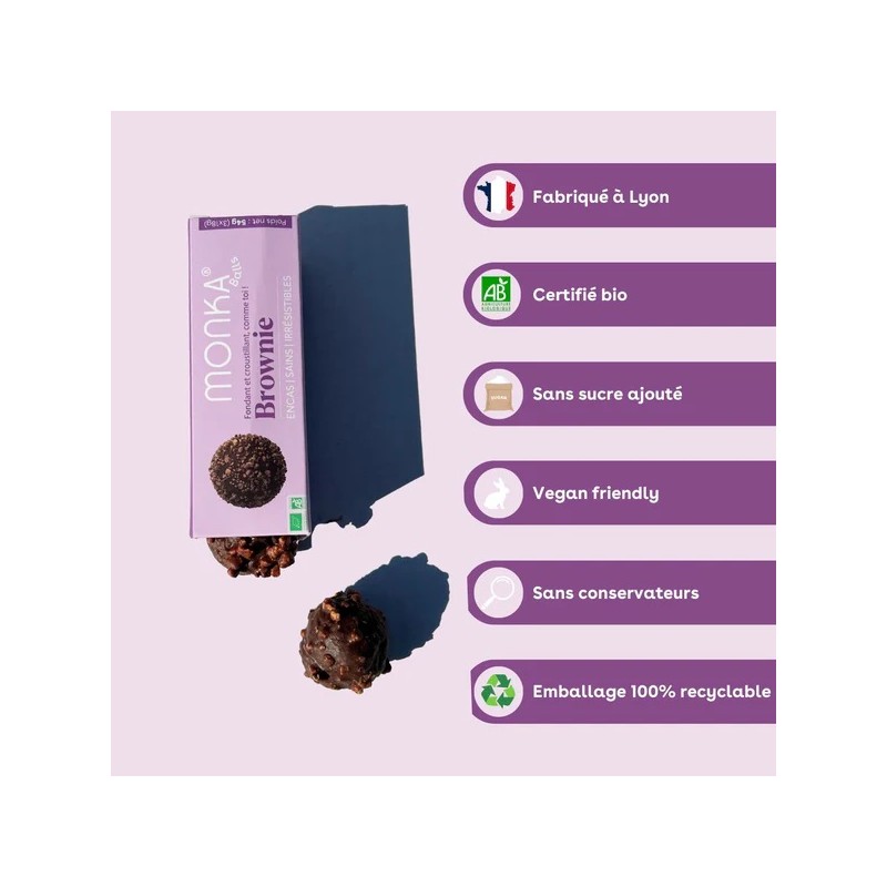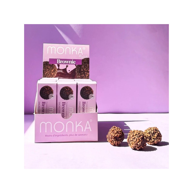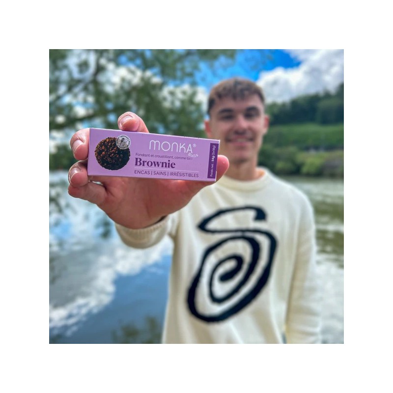 Découvrez les Monka Balls Brownie, une energy ball bio, vegan et fabriquée en France ! Confectionnées à la main dans un atelier lyonnais, elles sont sans conservateurs ni additifs, pour une collation saine et ultra-gourmande. Avec seulement 70 kcal par ball, elles sont parfaites pour l'entraînement, la récupération ou un snack équilibré.