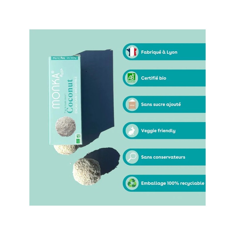 Alors fonce sur ce pack de Monka Balls Coconut ! Un concentré d'énergie positive, 100 % clean, 100 % plaisir. Commande maintenant et glisse-les direct dans ton sac de sport. Ton corps (et tes papilles) te remercieront.
