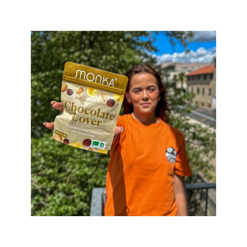 (Mixture of peanuts, dried fruits and chocolate) Banana chips (banana, coconut oil, cane sugar) Peanuts, dark chocolate chips (cocoa mass, cane sugar, cocoa butter, vanilla extract). No added salt