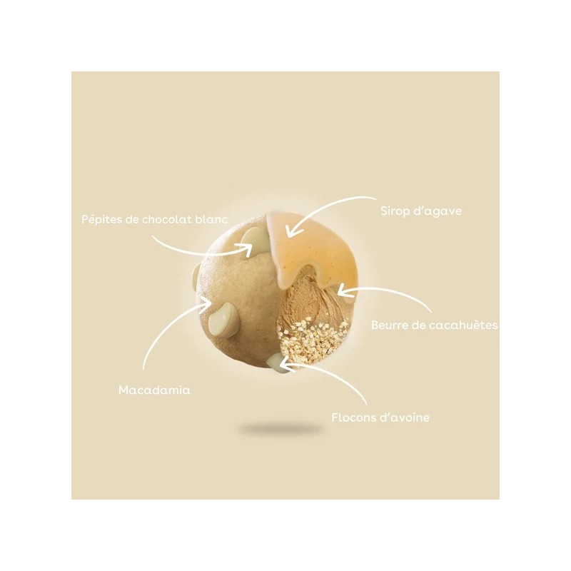 Organic peanut-based ball: 40% Peanut butter*, Agave syrup*, Oat flakes*, White chocolate chips* (cane sugar, cocoa butter, milk powder, vanilla) Macadamia*, Flower salt.