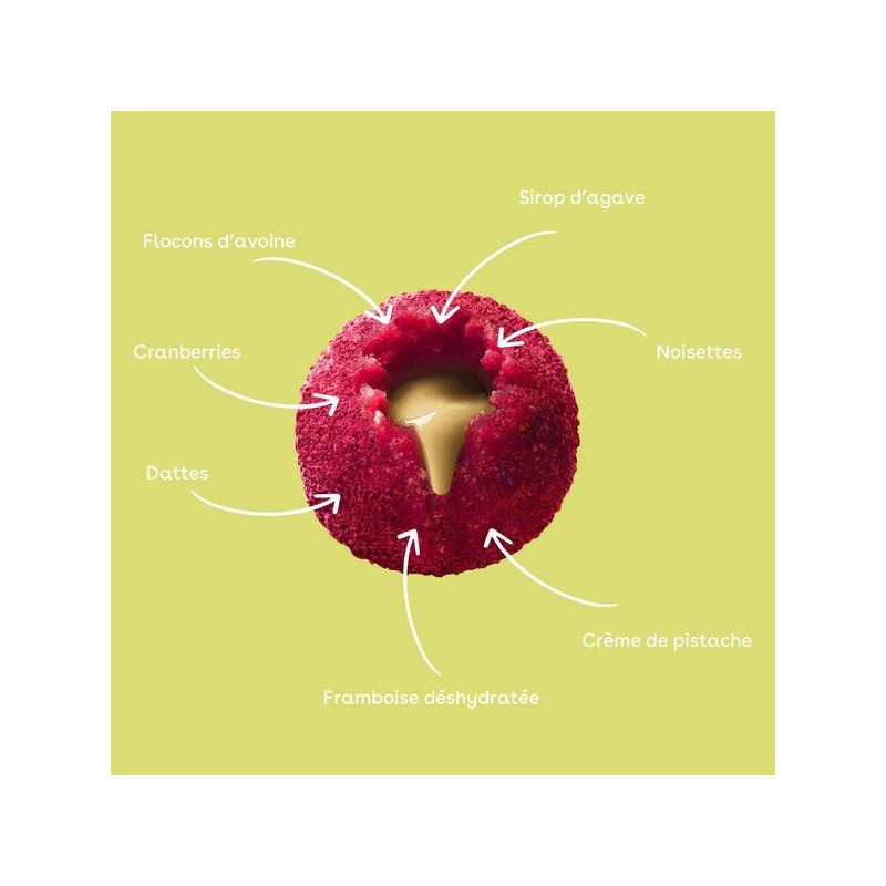 Organic ball made from raspberries and pistachios: Canadian cranberries, dates, oat flakes, hazelnuts, 10% pistachio cream (sugar, pistachio, sunflower oil, milk powder, cocoa butter, Guérande salt), Agave syrup, 3% dehydrated raspberry.